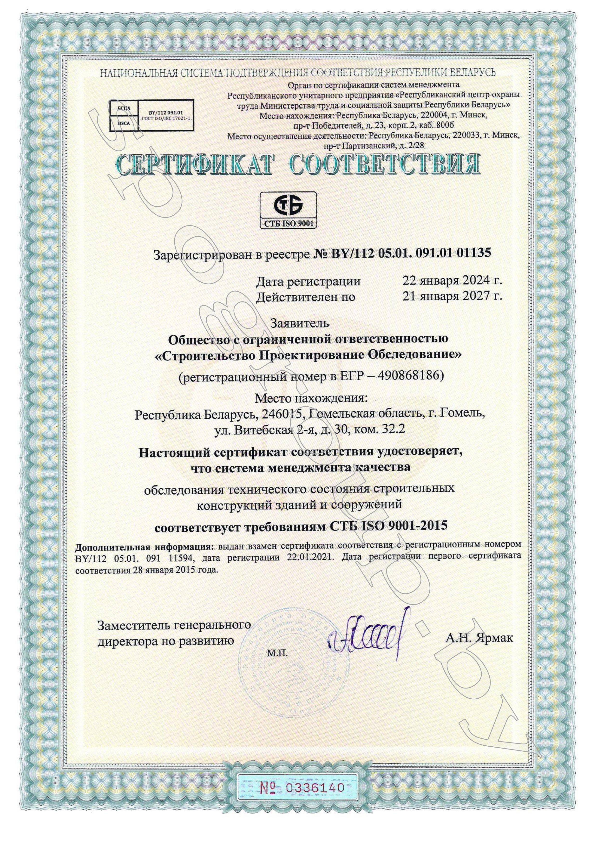 В ООО «Строительство Проектирование Обследование» внедрена и результативно функционирует сертифицированная система менеджмента качества в соответствии с требованиями СТБ ISO 9001-2015 (сертификат соответствия № BY/112 05.01.091 11594, до 22.01.2024 г).